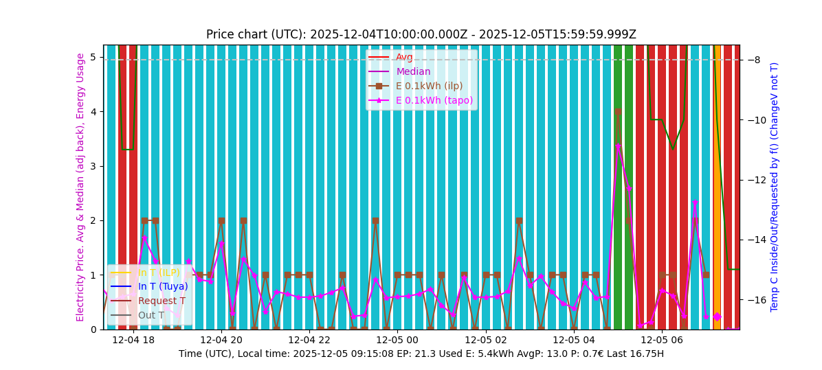 Pyynti ILPille on funktio pörssisähkön mukaan (oma python) eli leikataan korkeammat hinnat (punaiset ja lisätään vihreillä ennen korkeampaa hintaa. (pymelcloud)