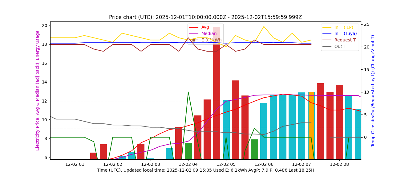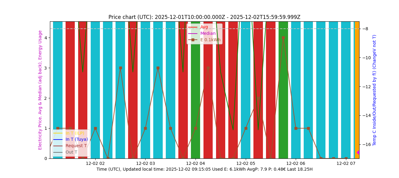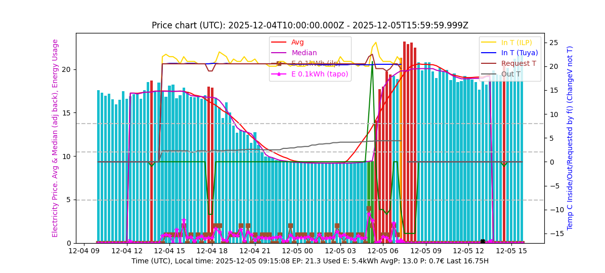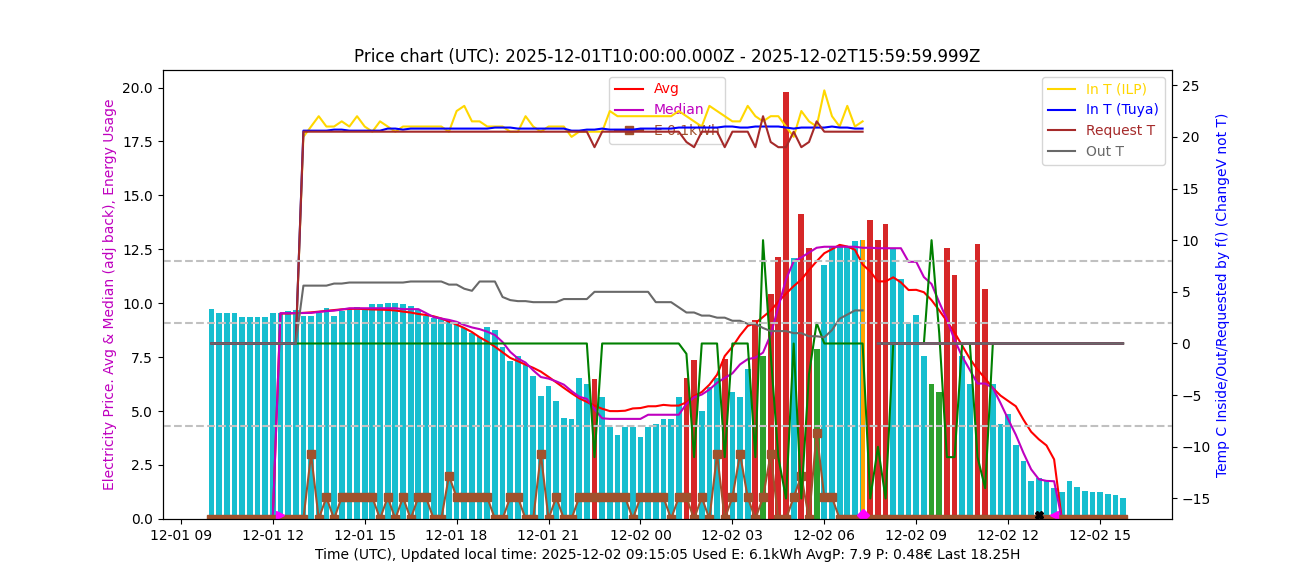 Itse päätin tehdä oman optimointini tunnin jaksoissa tunnin keskihinnalla. Vartin ohjauksissa on se huono puoli, että jos sattuu sulatus siihen, niin koko jakso meni pilalle. Sisälämpötilan annan heilua 20,5-22 astetta. Voisi ehkä nostaa vähän tuota ylärajaa, mutta parin asteen heittely ei vielä itsellä tunnu pahalta. Eron tasaa se, että onko huppari päällä vai ei. Tuolla saa ~15kWh lämpöakun/-varaajan aikaan. -5 asteen pakkasilla omassa talossa se tarkoittaa, että max 3h ajaksi voisi lyödä lämmitykset pois päältä ja oltaisiin aloituslämmössä. Riippuu ihan häviöistä ja lämpökapasiteestista, että paljonko pystyy kiertämään kalliita tunteja (ja toki tämä varmaan vaikuttaa siihen, että miten paljon aikaisemmin ylilämmittäminen kannattaa aloittaa?).