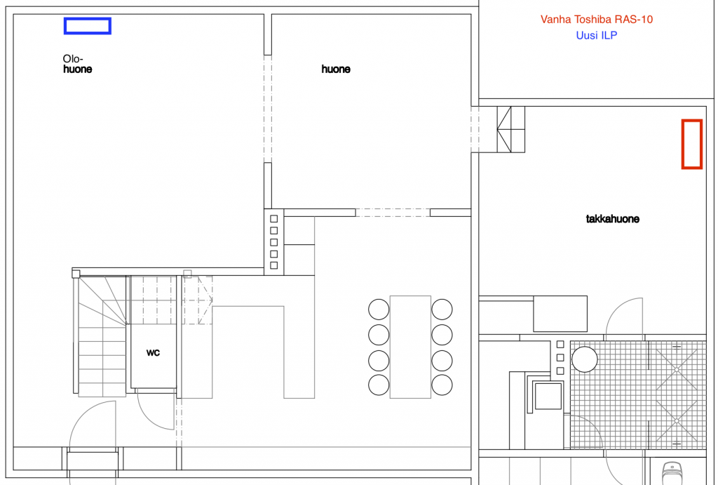 Takkahuoneessa tarvitaan lämmönlähde eli sinne varmaan yksi jäisi joka tapauksessa. Oviaukon yläpuolelle saattaisi kyllä saada sisäyksikön ja putket vietyä kylmän vintin kautta ulos. Tai sitten olohuoneeseen. Eteistäkin on mietitty mutta sinne ei oikein mahdu ennen isompaa remonttia.