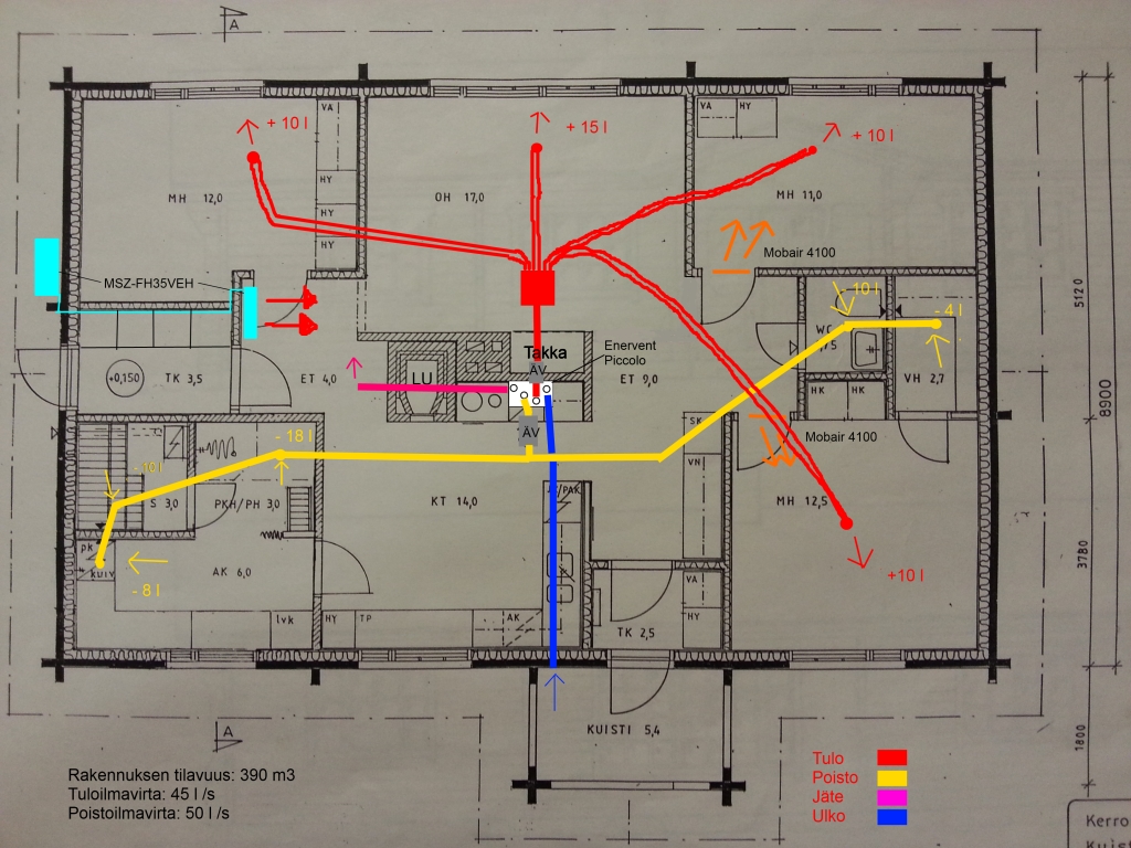 Talon tilavuus on 390 m3, joten laskennallisesti ilmanvaihtoa tulisi olla 54 l/s. Vähän pyöristelemällä päädyin lukuihin tulo 45 l/s ja poisto 50 l/s.