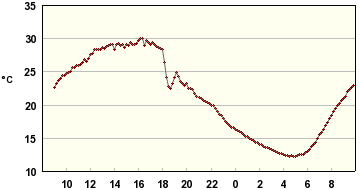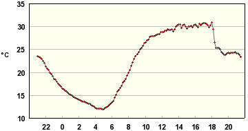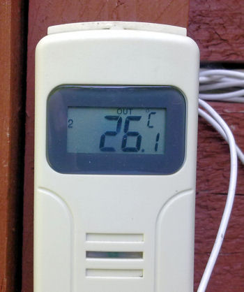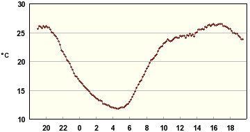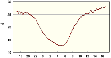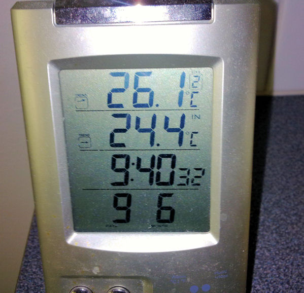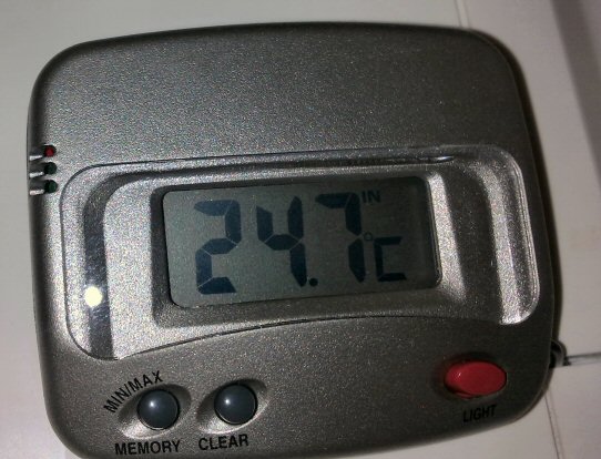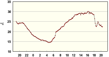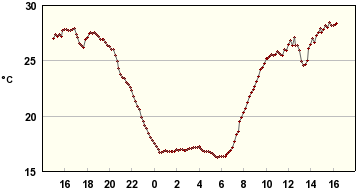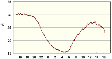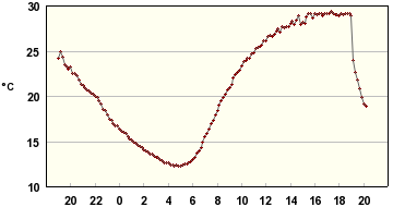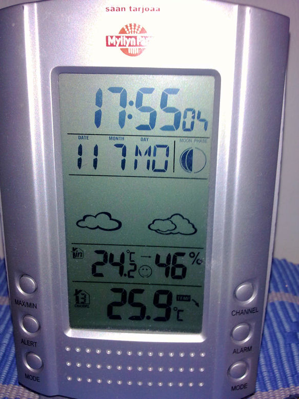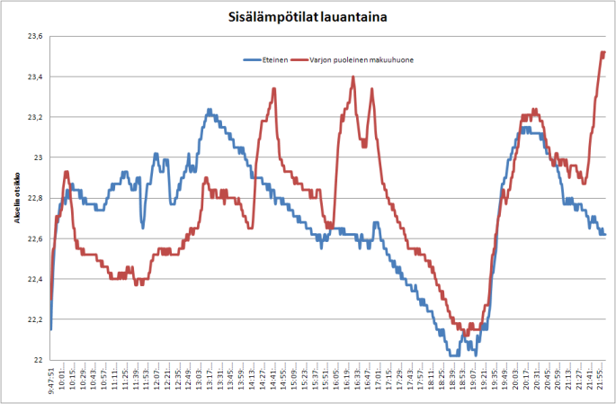 Tässä reilun vuorokauden sisälämpötilaloggaukset muutamasta paikasta; eteisestä ja varjon/lännen puolella olevasta makuuhuoneesta