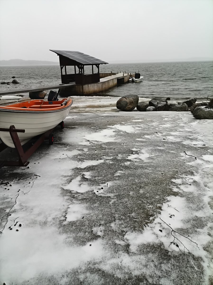 Yöllä vielä vesisade ropisi, nyt on muutama milli valkoista täällä rannikolla ja vajan seinään on tosiaan vesipisarat jäätyneet. Lumi ei haittaa mutta "tie" on kuoppainen pohjoistuulen ansiosta. :( Panelit on pysyneet puhtaina, hyvä juttu huomista aurinkoa varten. Ei tarvitse varmaan mennä paljoa sisämaata kohti kun näkymä on jo valkoisempi.