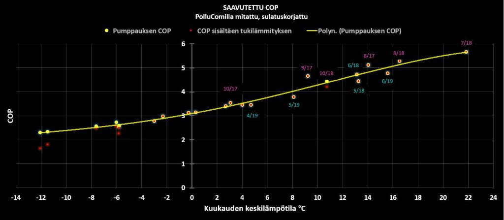 Syksyllä on ilma kosteaa. Tämä toki nostaa suhteessa yölämpötilojakin, mutta merkitystä on myös kosteuden tiivistymisen lämmitysvaikutuksella höyrystimellä.Setän COPit ovat syksyllä selvästi paremmat kuin keväällä. Käyrän yläpuolisten pisteiden merkintä pisteen päällä ja alapuolisten pisteen alla. Aika selvästi kevät ja syksy erottuvat. Ei selvästi tykkää kylmistä öistä.