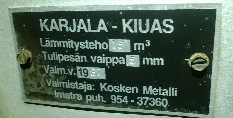 janti sanoi:Kyseessä on Karjala kiuas (kahden henkilön siksi tunnistama joista toinen oli piirinuohooja) , jota valmistettiin ainakin 80-luvun alussa ja ehkä myös 70-luvun lopussa. => Ikä kiukaalla on noin 30 vuotta (tai hiukan enemmänkin).