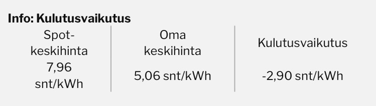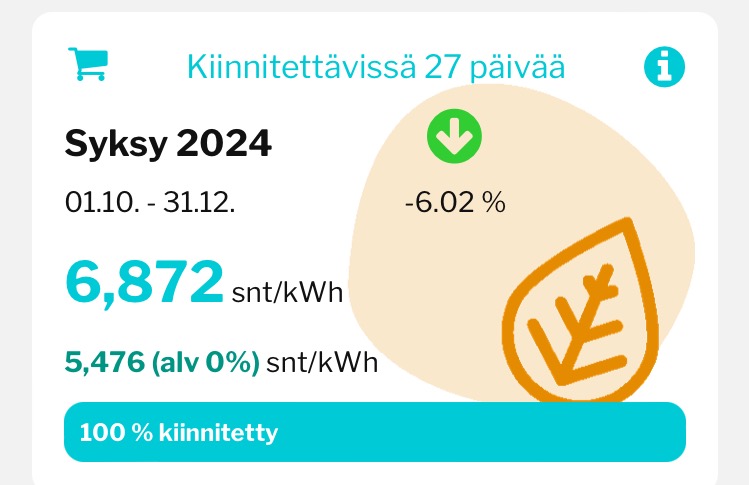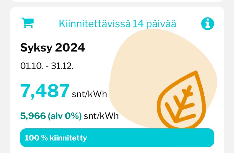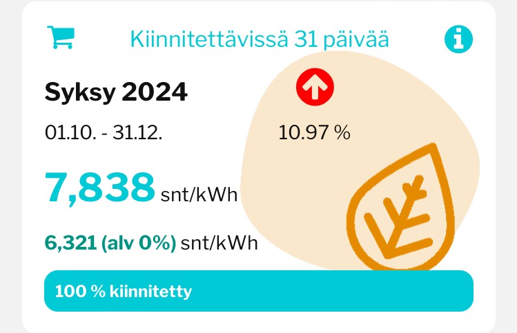 Täällä kanssa odottaa Q4 6,9 c/kWh kiinnitys, oli aiemmin pitkään 6,5 c/kWh, joka taisi olla liian optimistinen. 11 päivää aikaa katsella tuleeko loppukiri ja tippuuko hinta alle 7 c. Tietty nykyinen OL2 tilanne voi vaikuttaa, ettei niin tule tapahtumaan. Jos ei, niin taidan mennä ilman kiinnitystä loppuvuoden.