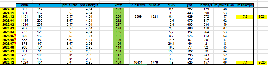 Ja juu, talon ostin Elokuussa. Eli hirveän kauan ei ole keritty vielä asua. Ihmettelen kun kulutus monin kertaistui heti kun vuosi vahtui, vaikkei hirveitä pakkasia ole ollut.
