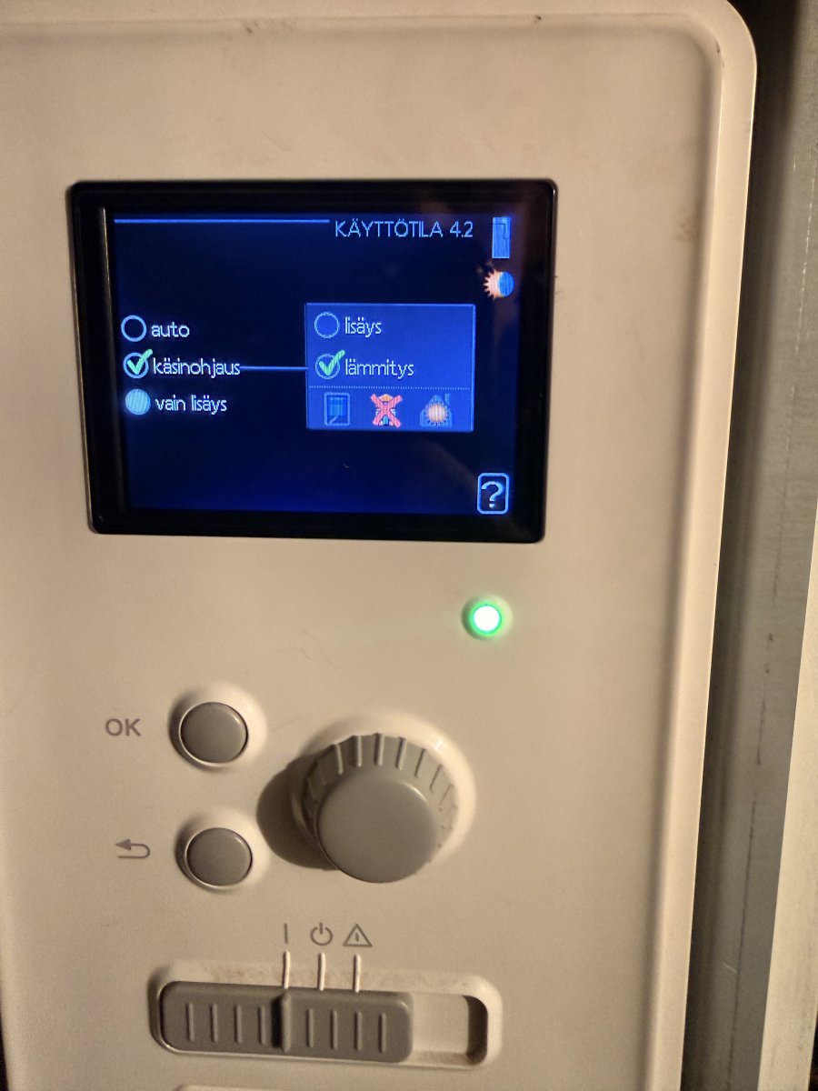 Vilpin käyrä 8 ja vastuksen käyttö pois päältä. Alakerran ilppi nyt käytössä +22 pyynnillä ja nopeus AUTO. Yläkerran ilppiä en kokenut tarpeelliseksi käyttää, makkareissa 19-20 astetta nyt.