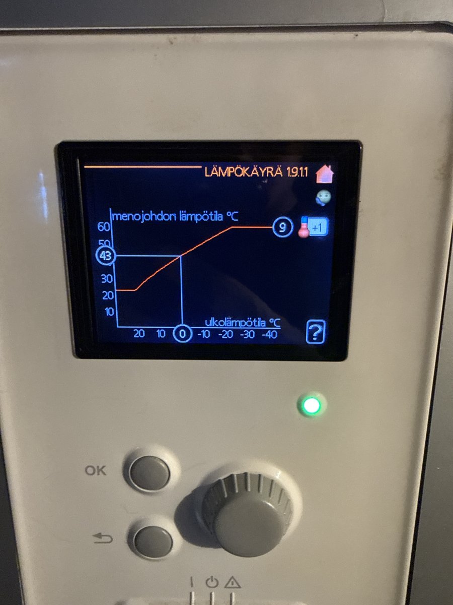 Minulla on sama värkki ja patterilämmitys. Käyrä näyttäisi olevan sinulle 4, kun pitäisi olla 9.