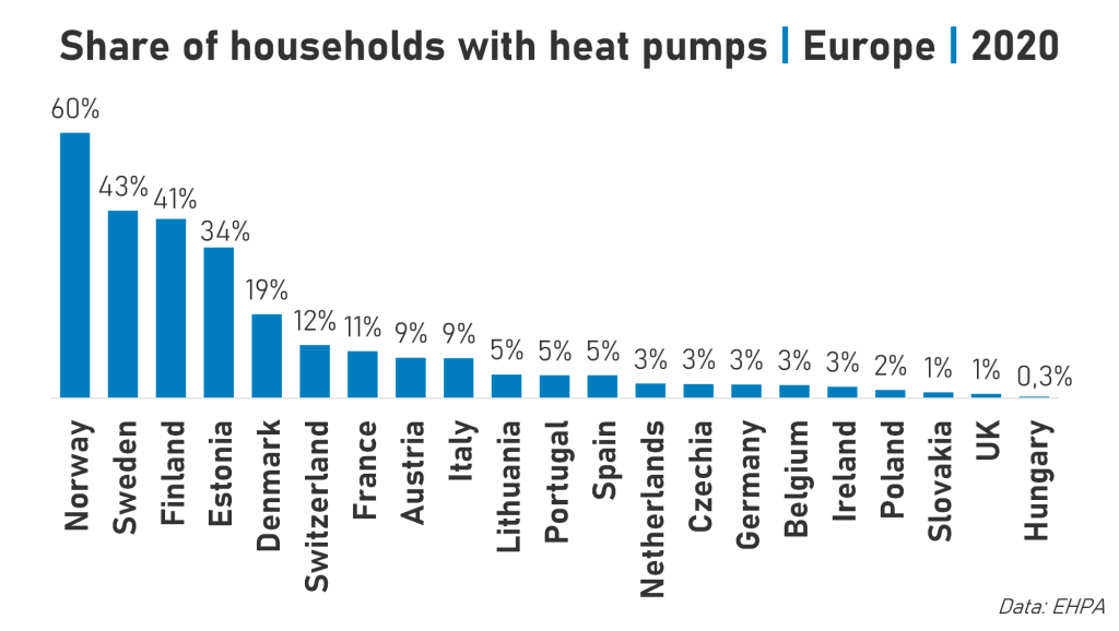 Pohjoismaat edustettuna hyvin europpalaisten maiden listalla missä on paljon lämpöpumppuja asennettuna. Tanskassa on yllättävän vähän myös pumppuja jostain syystä.