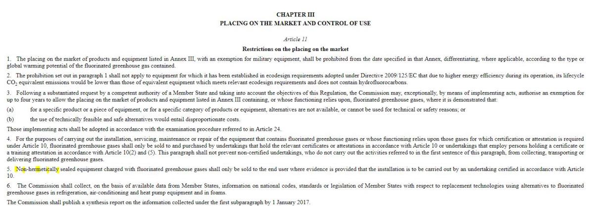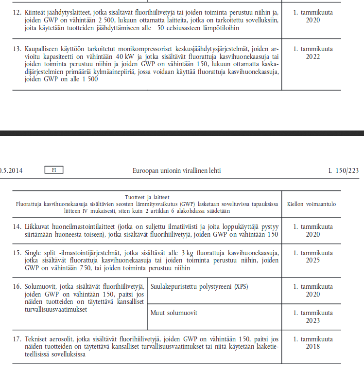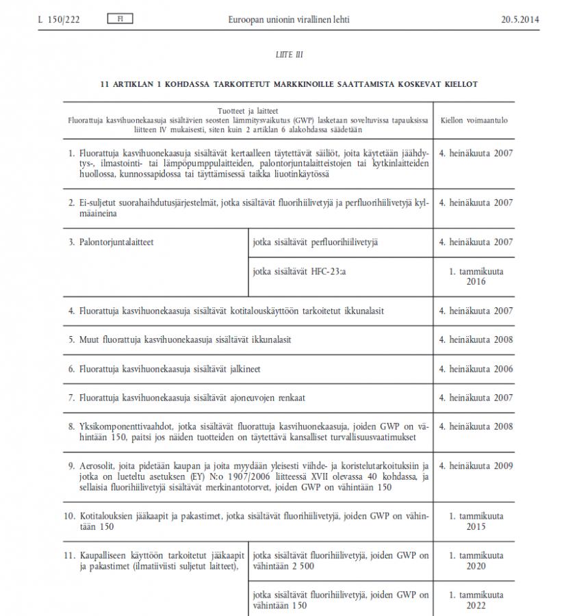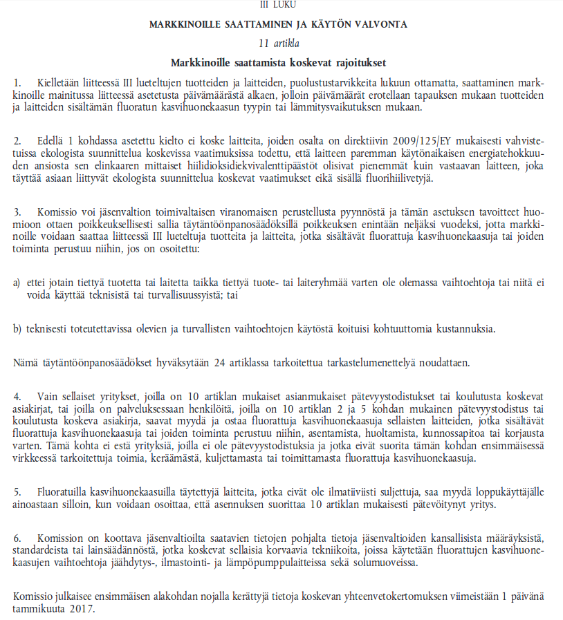 SON sanoi:Alla F- kaasuasetuksen 11 artikla. Kun lukee sen ja sisäistää kokonaisuudessaan mitä tarkoittaa sen 2 kohta direktiivistä 2009/125/EY ja toisaalta 5 kohta kylmäaineella täytetyn laitteen myynnistä niin: kysymys on siitä että kumoaako 5 kohta 2 kohdan vai ei. Smiley211006
