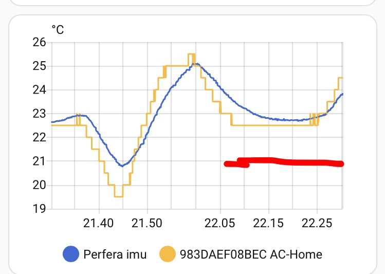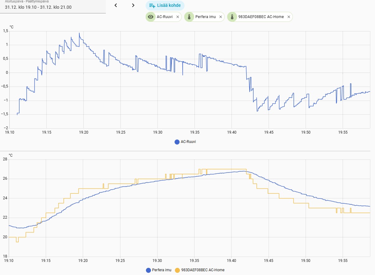 Sisäyksikön päällä on RuuviTag mittaamassa imuilmaa ja ilpin oma anturi on AC. Tämmöistä erokäyrää niistä tulee.