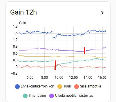 Eli kuvassa ilmanpaine (vihreä) lähtee kasvattamaan kerrointa ja 4h myöhemmin alkaa vasta ulkolämpötila (violetti) nostaa kerrointa.