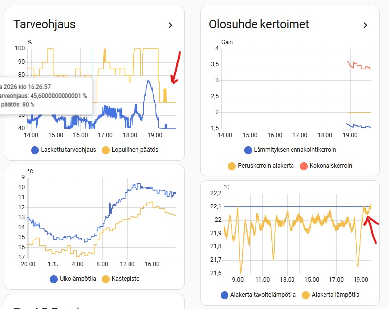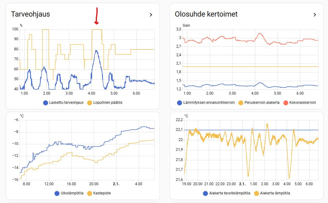 Ulkona -14, lähes lämpötilatavoitteessa pysytty. Tarveohjaus liikkuu 60-100% alueella. QO päällä.