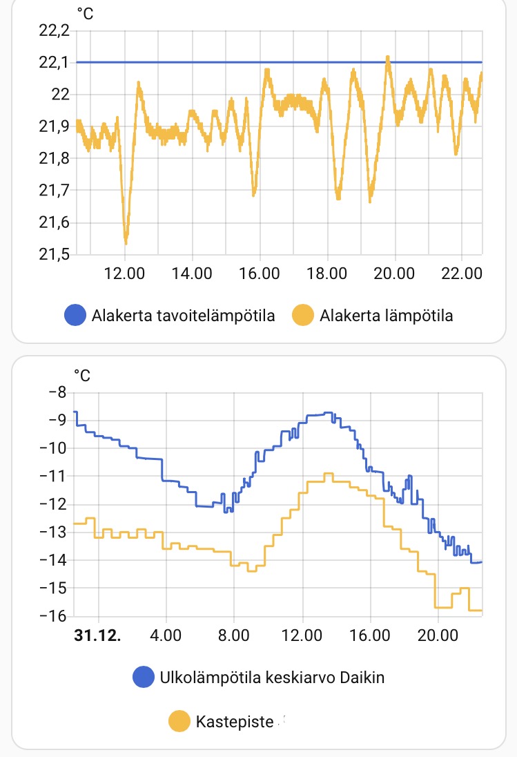 Itsellä Nibe pilp päälämmitysmuoto, ja Daikin tukee sitä, tavoitteena pitää sisälämpö välillä 21-22 ja minimoida molempien sulatukset ja turhat kompuroiden käynnistykset. Daikinin ryntäilyä koitan hallita automaatiolla asettamalla QO:n päälle sulatuksen ajaksi (jos ei jo päällä). Käppyrää tältä päivältä alla (ulkolämpö n. -5 C)