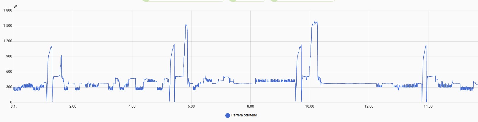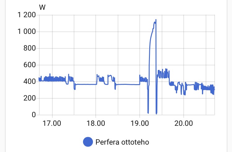 Vaikka kauempaa mittaiskin niin eikös se nosta tehot silti tappiin, kun ollaan 2 astetta alle tavoitteen? Sulatuksen jälkeen täälläkin on sallitut tehot tapissa. Jos sillä pumpulla pidettäis jotain peruslämpötasoa yölläkin niin se aamun nosto ei ole niin raju ja sulatuksia tulisi vähemmän. Sulatus laskee sisälämpötilaa ja usein tehtynä pumpun hyöty heikkenee. Varmaan oli tiedossakin. Niin kuin aikaisemminkin sanoin niin ilppiä ei kannata käyttää kuin puuhellaa, se on kovin suuren lämpötilaeron tappamiseen huono laite, sen on ammattimiehetkin tunnustaneet. Peruslämmönpitoon ja lauhemmille keleille hyvä laite. Myöskin ainoaksi lämmönlähteeksi kyseenalainen kovilla pakkasilla.