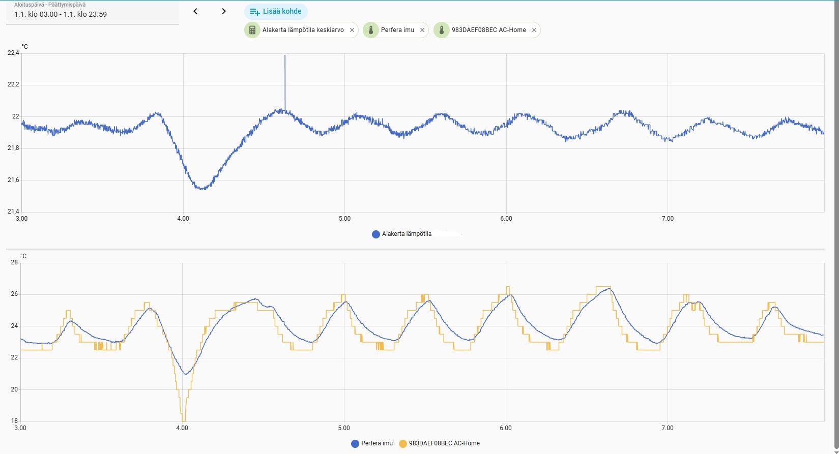 @heebo1974 , kyllähän lämpötilansäätö on onnistunut arviolta ainakin sieltä 1800-luvulta asti. PID-säätimiä on ollut olemassa jo 1930-luvulta saakka. Vaikuttaa siltä, että Daikinissakin olisi aivan riittävän hyvä se säädin, mutta kun anturi johtaa harhaan, niin millään matematiikalla siitä ei saada hyvää. Daikinilla säästetty se vitonen yksikköä kohti jättämällä se anturi sinne kortille eikä viety johdoilla parempaan paikkaan. Anturi pitäisi olla vähintään johdoilla viety sinne imuilmavirtaukseen, mutta mieluummin monen metrin päähän laitteesta sopivaan paikkaan. Tässä saatu käsittääkseni Daikinin omalla logiikalla lämpötilansäätö toimimaan ±0,2 asteen tarkkuudelle: https://github.com/revk/ESP32-Faikout/discussions/244