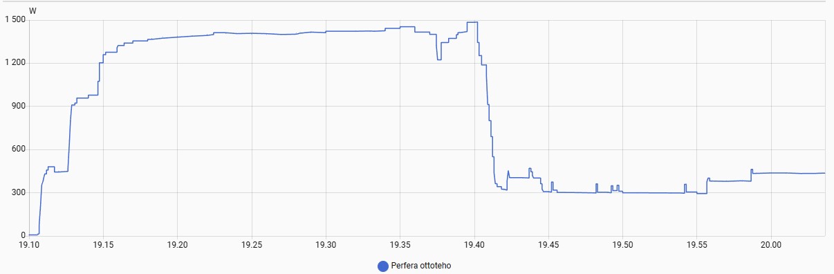 19.40 aikaan sulatuksen jälkeisen tehonnousun jälkeen ohjaus pudottaa tarveohjausta 60%:in.