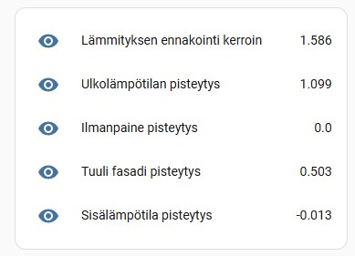Ulkolämpötila ja muutos vaikuttaa kertoimeen ja sisältää pakkastehostuksen. Ylin arvo kuvassa on lopullinen kerroin.