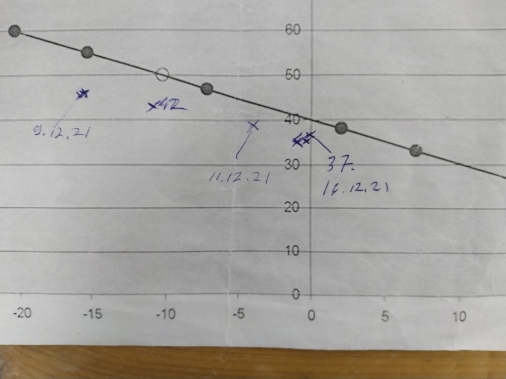 Meillä 0 asteessa on aina vaadittu enemmän lämpöä, että on saavutettu sisälämpö 22 C-ast. vastaavasti -20 ulkolämmöllä kierron lämpö on ollut n. 47 C-ast. eli kun pakkanen nousee, niin lämpösuora on hitaasti nouseva ja sallii lähellä -20 C-ast vaakasuoran n. 47 C-ast.