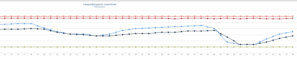 Itsellä myös käyrällä mennään nyt - 19c, ilman taukoja tehdään 24/7 kv tietysti ja sulatukset. Puskuriin ajetaan 38 ja paluu 32. Taloon menee sitten vähän alle jotain 33 ja paluu 25. Pääpiirissä. Kosteet tilat 33 ja paluu 30. Taita pääpiirin pumpun