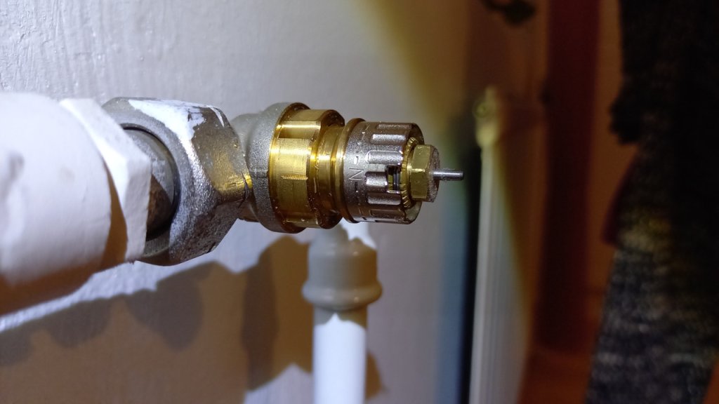 Patterin paluuputken säätöön en koskisi ainakaan ensi vaiheessa, vaan kokeilisin, jos ongelma ratkeaisi termostaatin modaamisella. Todennäköisesti talon patteriverkosto on aikanaan tasapainotettu paluuputkien säätöjen avulla. Näin talon joka huone on saatu saman lämpöiseksi, kun patteriventtiilit ovat täysin auki (termostaattejahan ei 60- tai 70-luvulla juuri tainnut olla, vaan ihan vain mekaaninen säätöventtiili joka patterissa). Lähtökohtaisesti termostaattien pitäisi olla turhia, kun käytetään Mitsubishin sisämittausta. Paitsi jos jonkin yksittäisen tilan lämpötila halutaan jostain syystä pitää alempana. VILPin kanssa ihannetilassa patteriventtiilit eivät rajoita virtausta, vaan kaikille pattereille tulee sopiva määrä vettä paluupuolen säätöön perustuen. Siksi on tärkeää, että tuo patteriverkoston tasapainotus säilyisi. Mutta jos sitä on tarpeen säätää, niin se onnistuu irrottamalla kuusiokantainen hattu patterin alaliitännän mutkasta. Säätöruuvi on hatun alla. Irrottaessa saattaa tulla pieni määrä vettä lattialle.