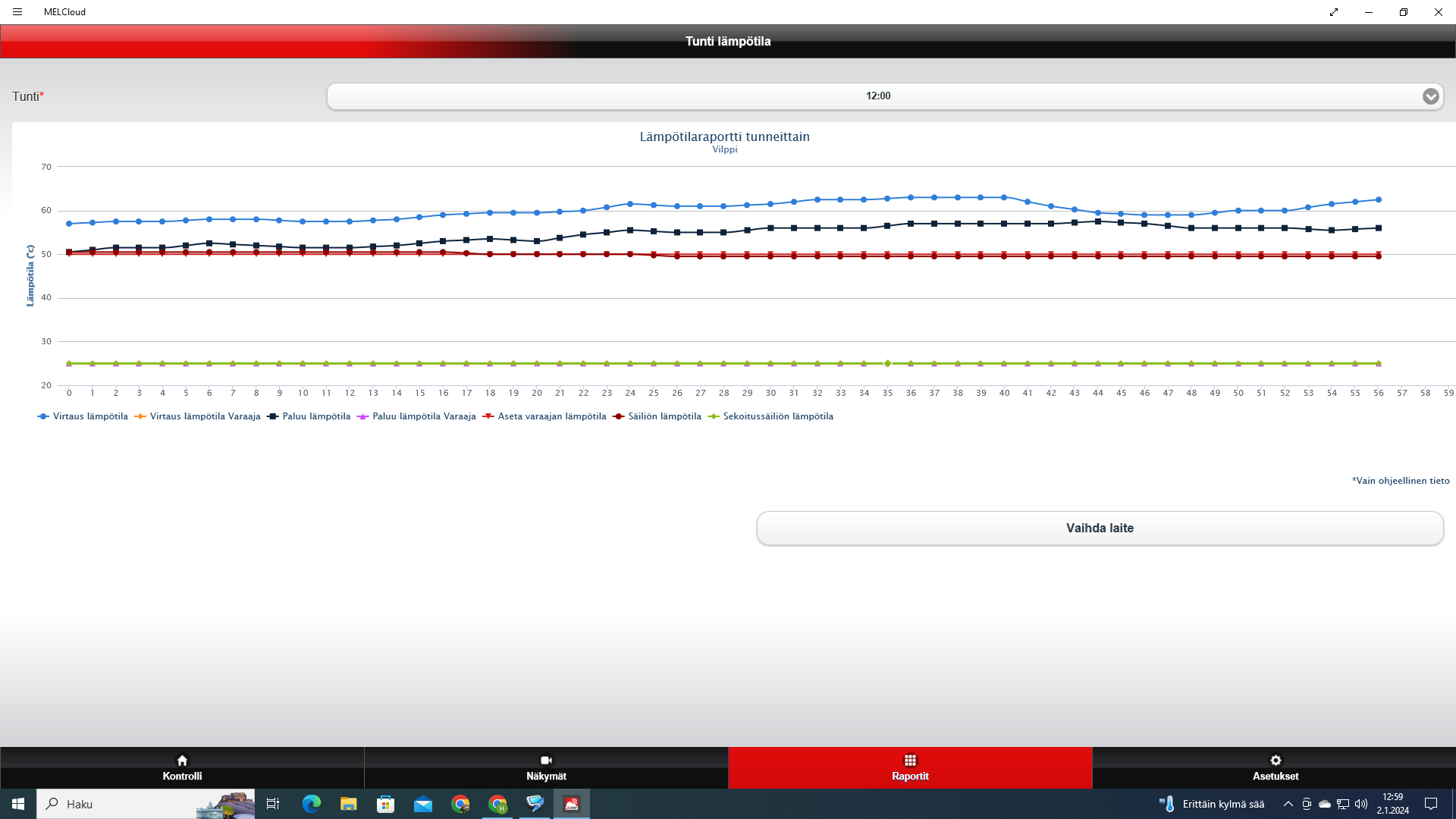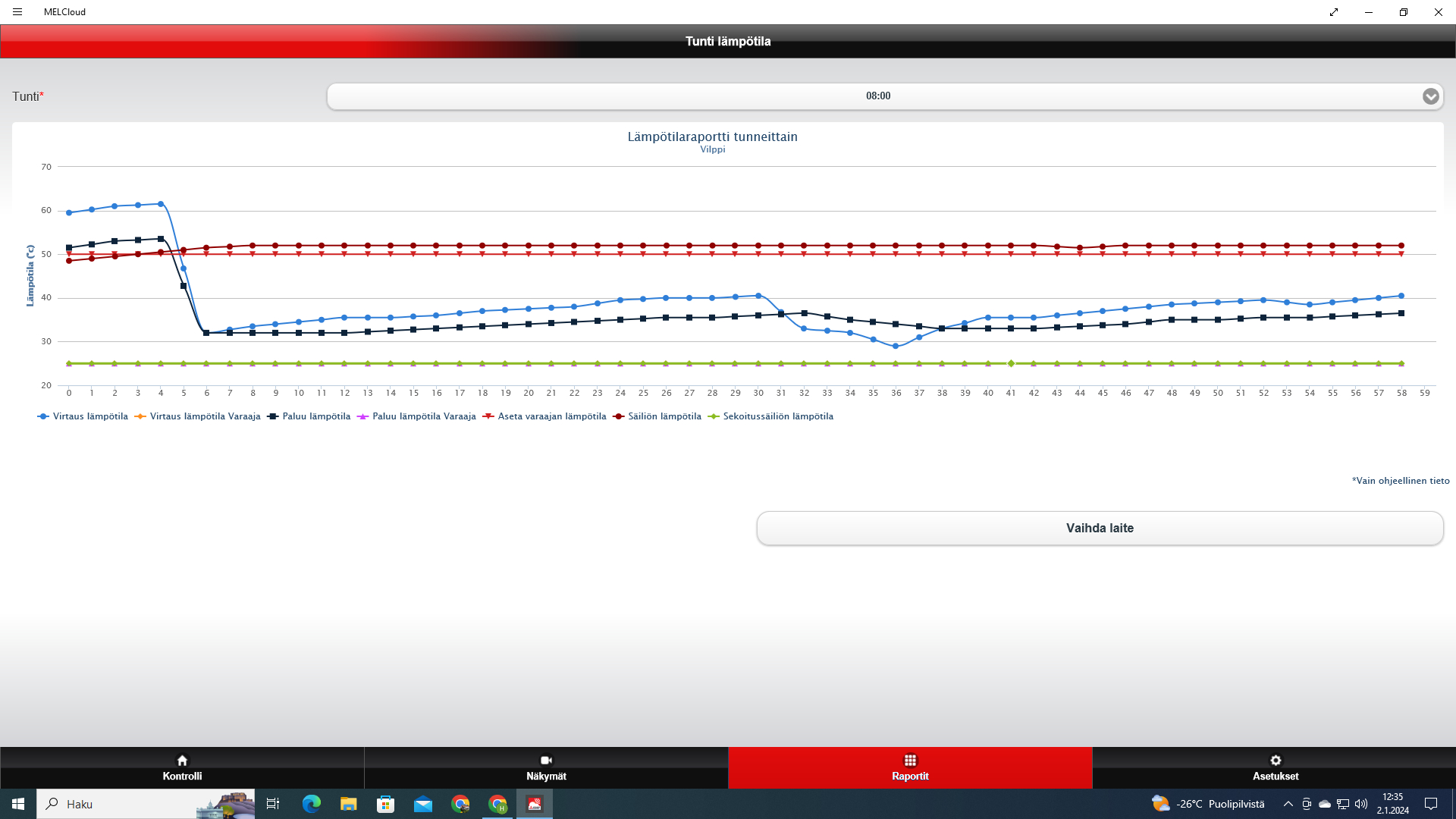 Mutta kun vaihdoin tuon huonelämpötilan ohjaus asetuksen 10minuutista -> 60minuuttiin niin tämän jälkeen on käynyt tasaisesti ja kokoajan(Paluuvesi patteriverkolta n.3-4c viileämpää, kuin meno).