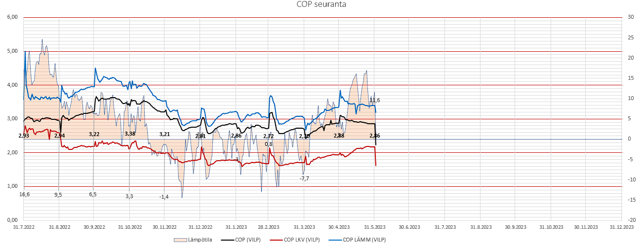 Toimii suht hyvin -18 - - 20 pakkasella ja cop on siinä 2 pinnassa. Sen kylmemmällä tulee vastus apuun 3kW ja hetkenpäästä toiset 3. Eli periaatteessa tuo kylmätoiminto -23 on passeli omalle koneelle. Sillä kustannuksissa et säästä mutta todennäköisesti säästät hieman konetta. Tuo vastus toki lähtee pois kun saavuttaa menoveden lämpötilan joten toimii ok.