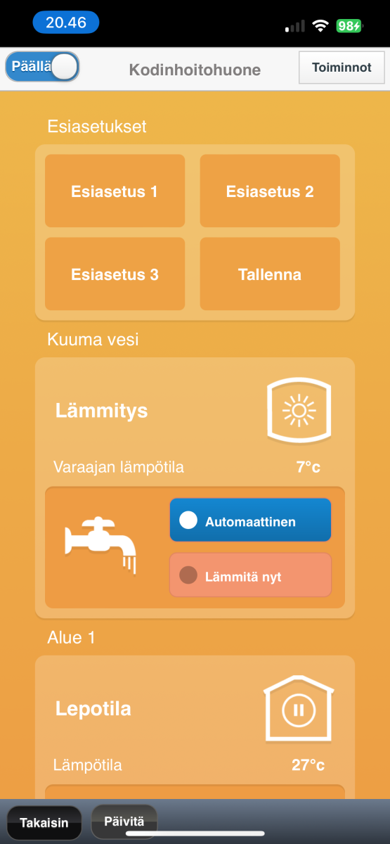 Sinänsä tuo toimii toki ihan fiksusti kun yrittää ennakoida lämpötilan muutoksista seuraavaa tehontarvetta, mutta torpan eristystasosta riippuen tuo ei välttämättä aina toimi ihan optimaalisesti.