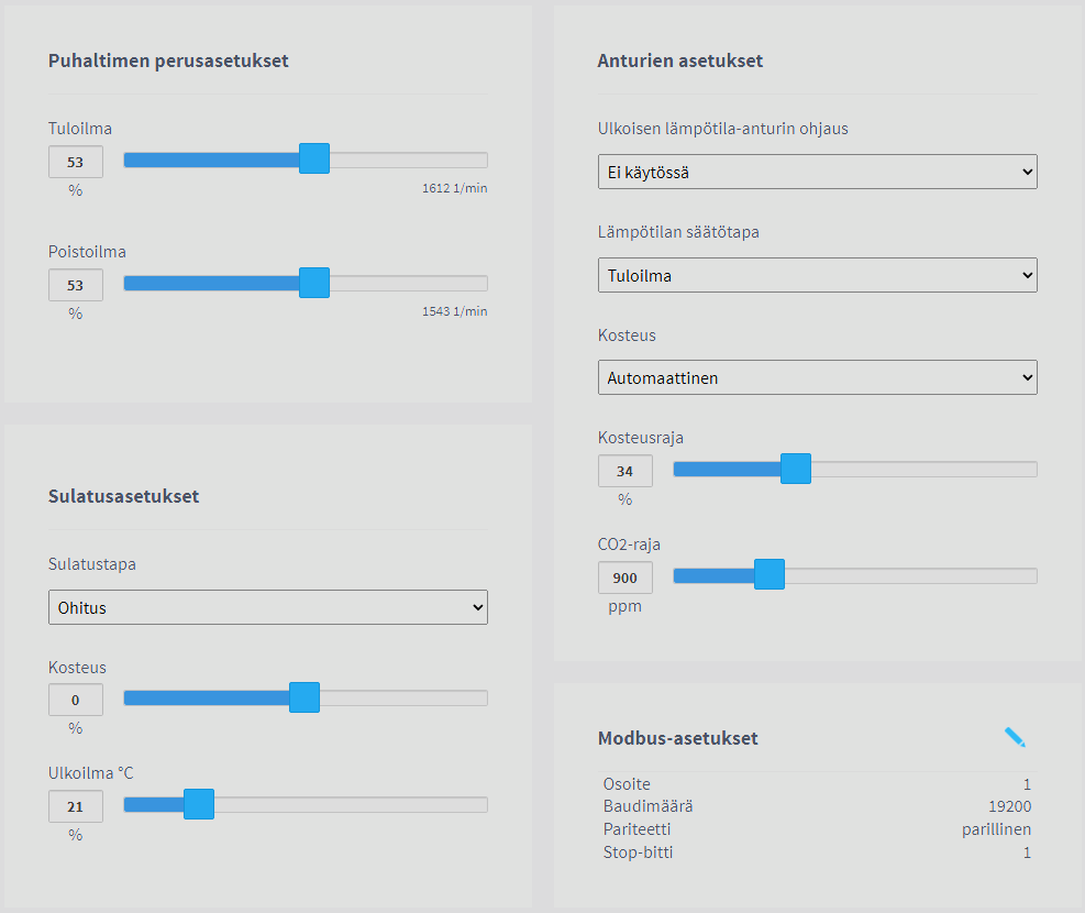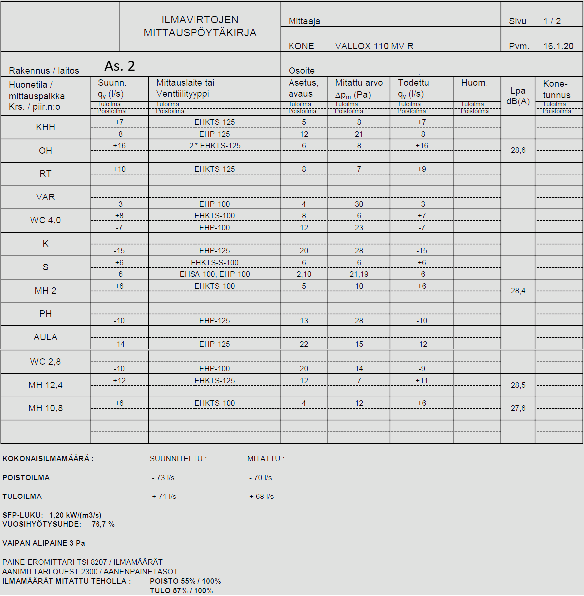 - Pitäisikö Vallox 110 MV puhaltimen perusasetusten vastata tuota mittauspöytäkirjan kohtaa "Ilmamäärät mitattu teholla..."? Jos ei, niin mitkäköhän arvot siinä pitäisi olla? Tällä hetkellä 53% / 53%