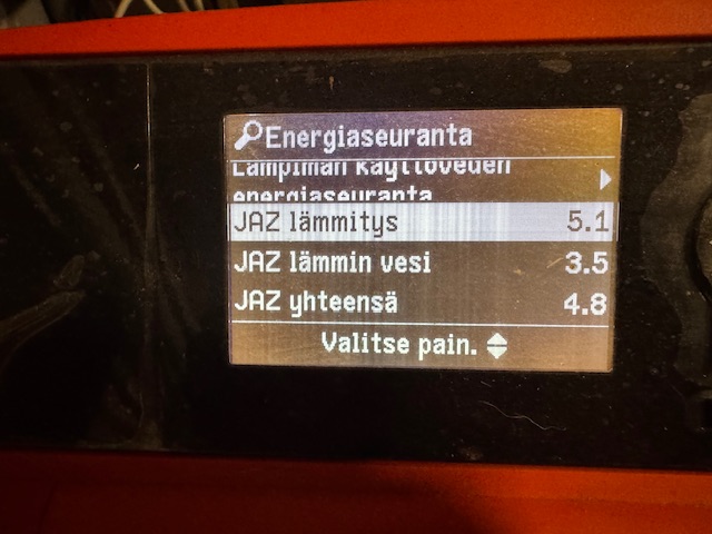 Kohtuu hyvät on myös laitteen ilmoittamat COP lukemat, kun laitoin kiertovesipumput suuremmalle ja sai laskea käyriä alemmas. COP lämmitykselle pomppii vieläkin väliä 5,1-5,2, mutta lämminvesi on kohta vuoden näyttänyt COP 3,5 ja yhteensä lukema ollut vajaann 1/2-vuotta tuo 4,9.