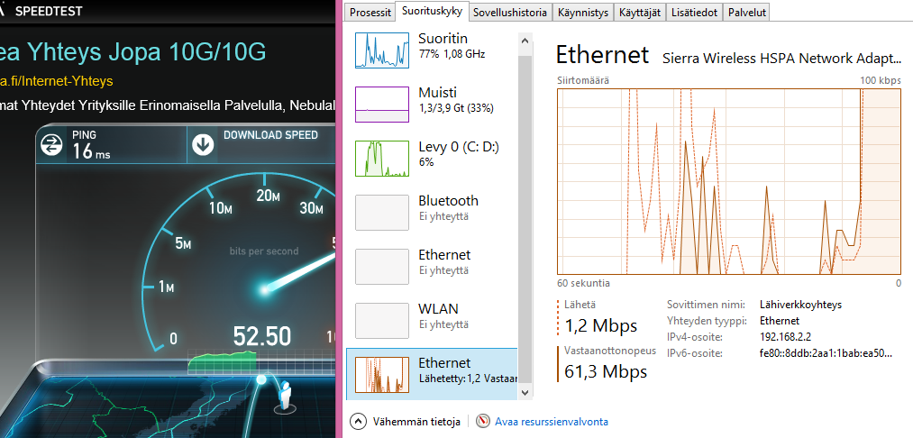 Ensi testi WLANin kautta 802.11n ja sitten modeemi suoraan USB:lla koneessa kiinni.