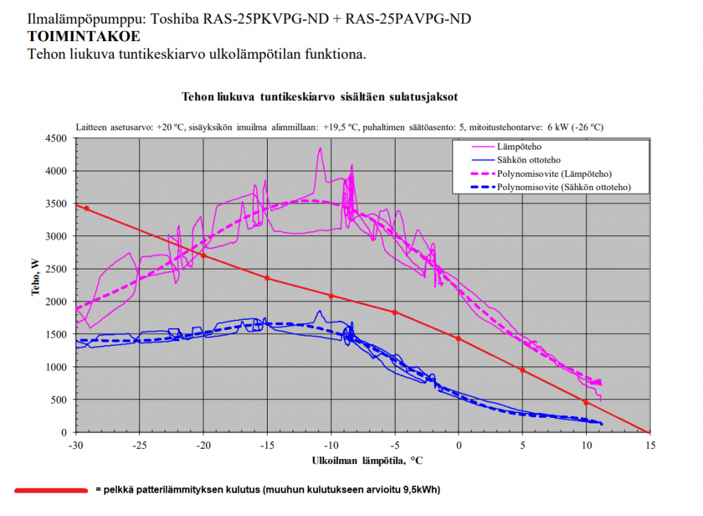 Täällä on käytössä kilpailijan leirin 25 sarjalainen (1kpl), syksyllä asennettu, niin vielä ei ole päässyt testaamaan kuinka kovalla pakkasella tulee raja vastaan, että vaatii takalta tai suorasähköltä apua. Yhden vuorokauden aikana oli kyllä pitkän aikaa -18c paikkeilla, ainakaan tuolloin ei vielä napsu loppunut. Käppyrään piirsin punaisella käyrän joka vastaa tehontarvetta suorasähköpattereilla, 21c päähuoneissa eli olohuoneessa ja keittiössä. Ymmärrän toki että ne jotka pitää hellelukemia sisällä pitkin talvea, niin sillon varmaan on pumpuista aina teho lopussa ;)