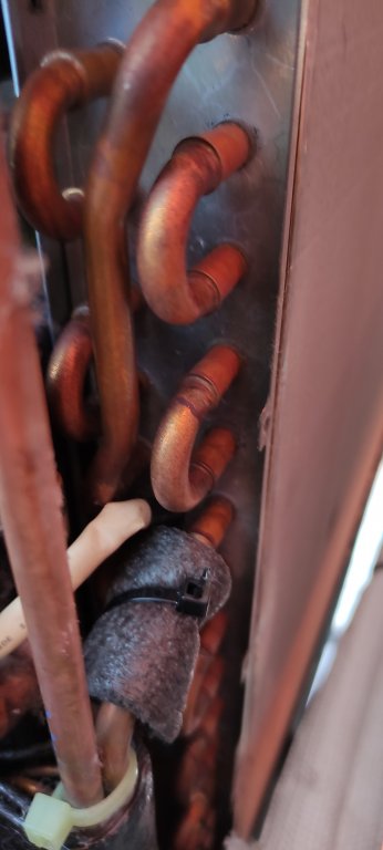 Etäkäyttäjänäkin ”pääsin” lauantaina tekemään lähityötä LN25:n kanssa ja tarkastamaan anturit (pakkasta -21). Pumppu kävi ennen anturien kopelointia 1 h sulatusväleillä. Katkaisin virrat turvakytkimestä (en tiedä katkeaa tällöin ulkoyksiköstä kaikki virrat?). Alhaalla oleva defrost anturi oli sula ja kuiva kuten aikaisemmalla kerralla viime keväänäkin. Lämpöeristyshuovassa oli vain muutama jäätynyt vesipisara. Sain nyt käännettyä defrost anturia enemmän sisäänpäin. Nostin sitä vähän, niin silloin se kääntyi enemmän sisään. Todennäköisesti se aiemmin tökkäsi kuvassa näkyvään nippusiteen lukkoon. Tällä defrost anturin käännöllä haluan vain varmistaa, että anturi ei olisi huopaa vasten.