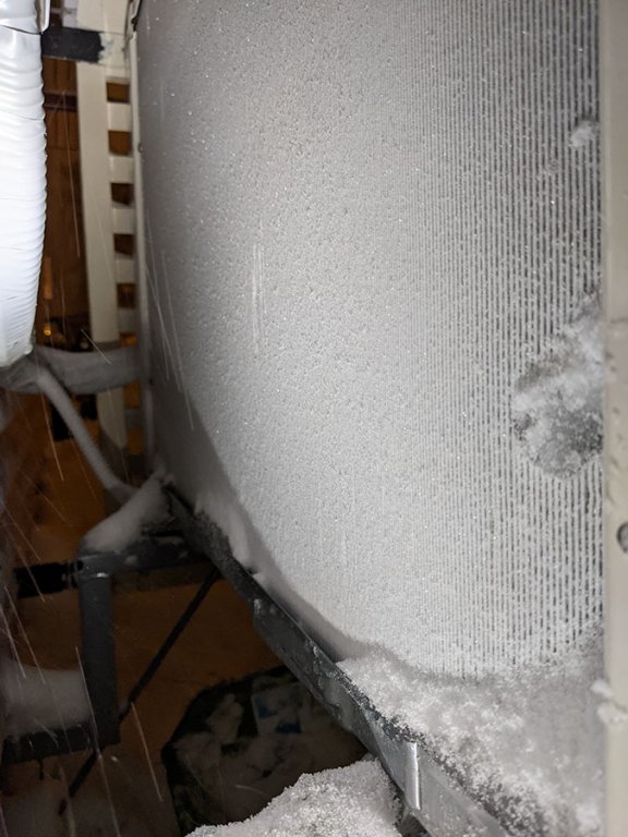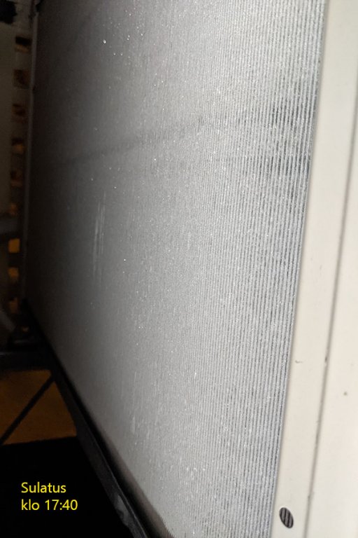 Ylhäällä oleva outdoor heat exchanger anturi oli myös minulla syvällä putkessa ja ihan jäässä, toisin kuin viime keväänä, jolloin se oli ihan märkä ja vihreä anturinjohdon suojaputkikin oli täynnä vettä. Anturin päässä oli myös jäätynyt ”touhutippa”. Vihreässä suojaputkessa ei ollut nyt vettä, eikä jäätä. Sulatin anturin ja kuivasin anturin ja anturikotelon sekä teippasin vihreän suojaputken umpeen, mutta en keksinyt ”tähän hätään” mitään, millä olisin lämpöeristänyt anturin. Käynnistin pumpun turvakytkimestä. Alkoi tehdä 1 h 20 min sulatusvälejä. Sitä ei nyt tiedä jatkoiko pumppu 20 minuutilla sulatusvälejä anturien koplauksien vuoksi vai uudelleen käynnistyksen vuoksi. Näillä sulatusväleillä sulatteli sunnuntai-iltaan, jolloin laitoin pumpun peruslämmölle +12. Tulevat sulatusvälit tulee näkemään loppuviikosta, kun alan nostamaan lämpötilaan peruslämmöstä.