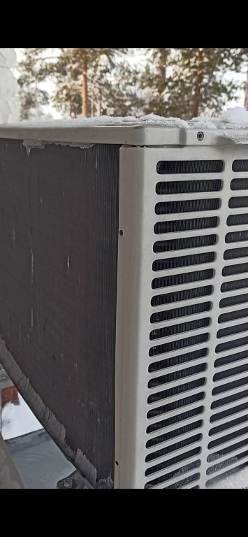 Minulla anturi keskiputkessa. Aukaisin paketin taas tänä aamuna. Anturi oli kuiva, mitään jäätymistä ei ollut. Huopa oli jäätynyt kauttaaltaan putkistoon kiinni. Leikkasin nyt noin 10cm palan huopaa nurkasta kokonaan pois. Nyt putkisto on sen osalta vapaa. Tuossa huovassa näkyi olevan ohut kenties bitumimatto välissä. Ylempi anturi oli suojauksesta huolimatta aivan jäässä. Tuolla nyt ei taida olla sulatusongelman kanssa tekemistä mutta kuivasin sen ja yritin laittaa paremmin eristyksen päälle. Ulkoyksikön pienet ruuvit alkaa olla vähenemään päin kun kohmeisin sormin niitä tiputtelee lumihankeen eikä enää löydä. :)