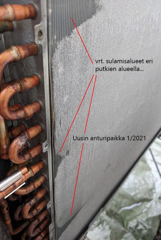 -kone nippun mutta ulkoyksikön kannen ruuvit piirongin laatikkoon jotta voi tarvittaessa käydä ilman työkaluja kurkkaamassa anturin tilanteen. Jos on tallettava lämpötilaloggeri niin siihen nauhoitus päälle ja tökkää anturin kennon lamellien väliin takakautta samalle kohdalle mistä tulee syöttöputki jossa sulatusanturi on kiinni