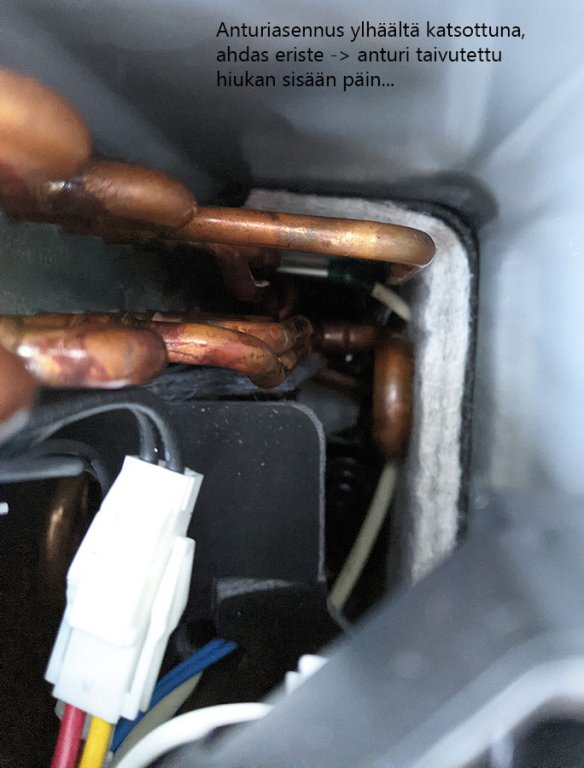 Anturin asennus kannattaa tehdä aina putken yläpuolelle, jolloin se ei kerää itseensä jäätä yhtä herkästi kuin ollessaan putken alapuolella. Samoin anturi kannattaa kääntää hiukan sisäpuolelle yläviistoon asentoon , niin ettei se ota kiinni tuohon äänenvaimennus-huopaan. Viimeisessä kuvassa näkyy eräänlainen anturin minimivälimatka huopaan, koska tämä asennustapa on toistaiseksi pitänyt tuon defrost-anturin jäätymättä omassa laitteessani. Kuva kertoo kuinka ahdasta tuolla on! Ts. asentaisin anturin nyt Juhaniston jäätymiskokemuksen perusteella tuon anturin selvemmin sivulle yläviistoon kulmaan (klo 10:30 suuntaan, nyt se on klo 11:00...11:30 suunnassa putken päästä katsoen).