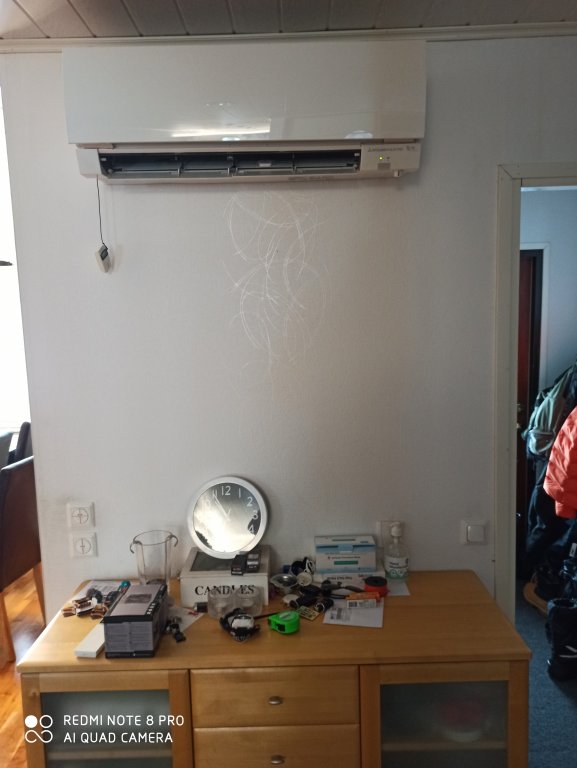 Myös minulla vanhassa FD-mopossa on lämpötila-anturi siirretty kotelon ulkopuolelle (kuvassa kaapin alakulmassa). Ainakin se hyöty tuosta siirrosta on että pyytilämpötilaa ei juurikaan tarvitse säädellä ulkoläpötilan vaihdellessa. Ottoteho pysyy rauhallisena (ei tosin ole dataa miten ennen siirtoa käyttäytyi). Sisäyksikkö on varsin avoimessa tilassa.
