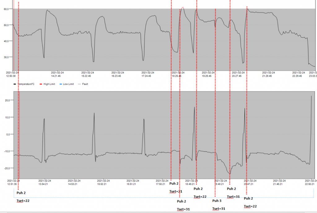 -Testeissä sulatus on ollut rinnan kytketyllä vastuksella estettynä jottei pumppu pääsyt karkaamaan omia aikojaan sulatukselle kesken testin ja sulatuslupa on annettu manuaalisesti