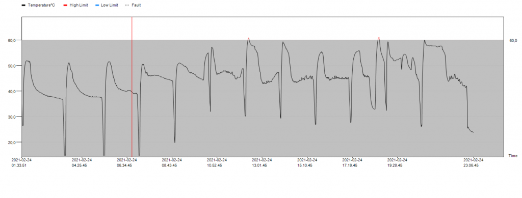 Ulkolämpötila on laskenut päivän mittaan -8°C -> -1°C. Nyt lyhensi lämmitysjakson 80 minuuttiin. Selvästi veti kennon kunnolla tukkoon, kun tuo dT nousi noin nopeasti. Hienosti kuitenkin sulatti kennon täysin puhtaaksi. Itse asiassa tuntuu että tukkoisemmalla kennolla sulattaa jopa paremmin pois mahdollisen alareunaan jääneen jääraidan -> isompi sulatusvesimäärä pyyhkäisee mukaansa.