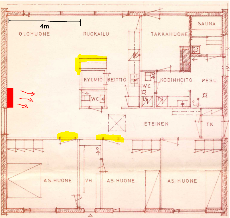 Mulla ILP on eteisen tuulikaapin aukon päällä. Nykyisin kun siinä ei ole väliovea ja aukkoa levennetty alkuperäisestä, niin tiedä sitten kuinka ulko-ovesta tuleva kylmä ilma vaikuttaa anturin aistimaan sisälämpötilaanOnhan tuossa paikkoja vaikka kuinka monta jota voisi kokeilla toki riippuu vähän siitäkin että mihin saa vedettyä siististi. Merkkailin kuvaan muutaman omiin silmiin sattuvan vaihtoehdon keltaisella.