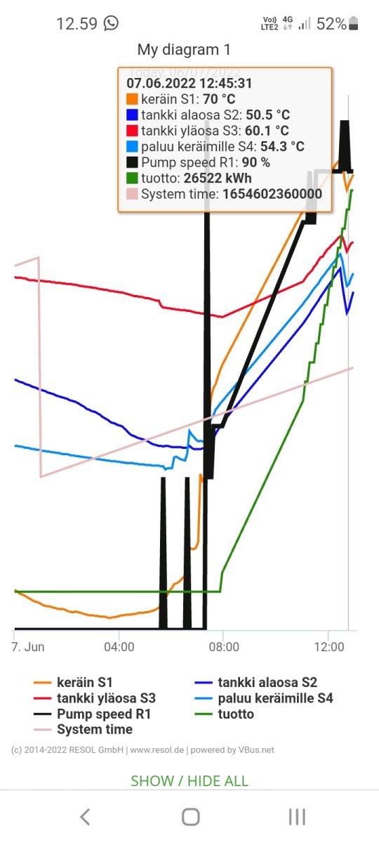 Kesäkuu-22 kokonaiskulutus 486 kWh. Aurinkolämpöä tullut 801 kWh ja se on aivan liikaa, pitää jo keksiä mihin sitä oikeen voi käyttää. 8 vuotta haaveilin kahden ison koivun kaatamisesta ja nyt ne on poissa, ja aurinkolömpöä tulee nyt 11 tuntia vuorokaudessa ilman taukoa. Uskomatonta että varaajan ollessa 90 asteinen aurinko lämmittää sitä vielä lisää, on se ihmeellinen pallo