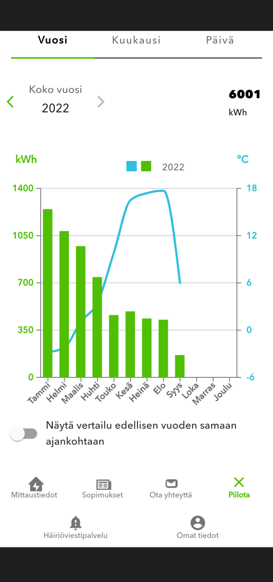 Sähkönkulutuksessa liukuva 12kk on 8858 kWh mikä on sikäli hyvä luku vanhassa talossa että mistään ei olla pihistelty.