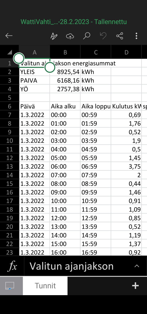 Helmikuu-23 sähkönkulutus 1026 kWh josta MLP käytti 373 kWh 3,97 copilla. Laskua vuodentakaiseen 5%.