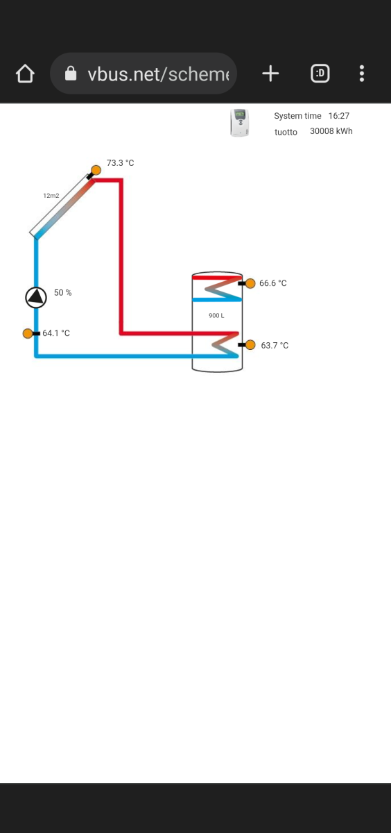 12 m2 tasokeräimiä ja Resol pumppuyksikkö. Resol tekee myös käppyrää ja laskee tuotot kunhan siihen saa syötettyä virtauksen, itse olen kalipeerannut sen pollucomilla.
