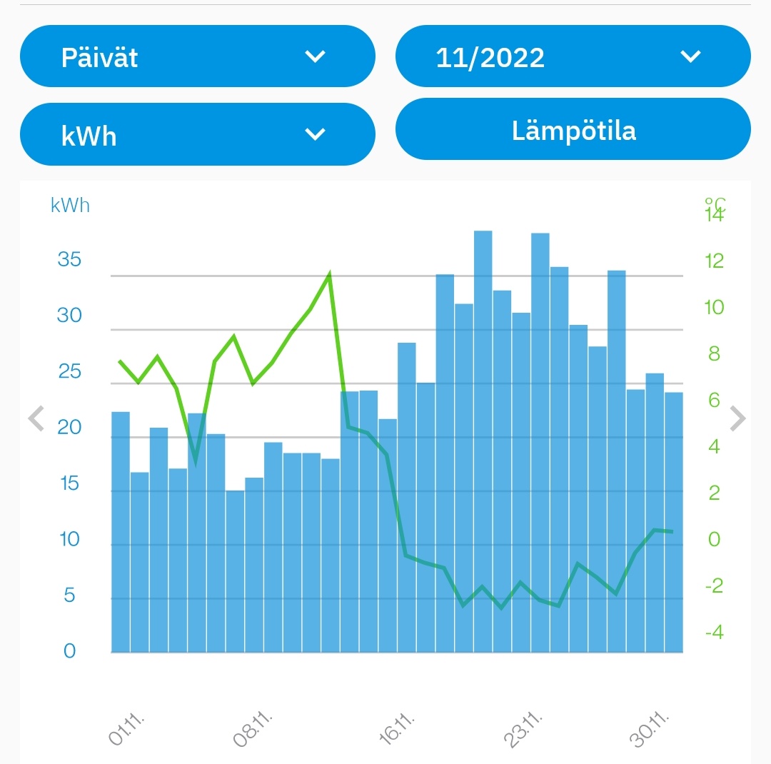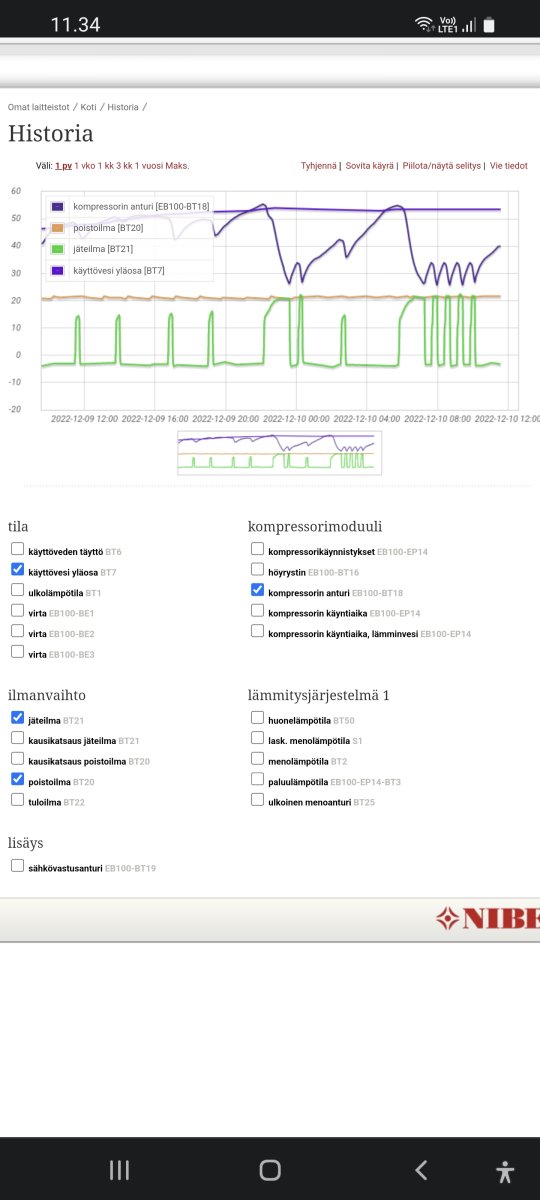 Shuntin avautuminen kokonaan tosiaan selittäisi nopean muutoksen. Tätä säätöä en ajatellut ollenkaan. Tässä käppyrät pdf-muodossa (+ pari tuntia lisää edelliseen kuvaan). Mitä pistin kuvaksi tuohon edelliseen on tuo ensimmäinen. Loput ovat yksittäiskuvia + viimeisenä lämmityksen pyynnin (jos laskennallinen, Calc. Supply, on pyynti) ja menoveden erotus.Kuva ei nyt näy, mutta kertoman perusteella voisi arvella lämmöntarpeen olleen paljon suurempi mitä kompura jaksaa tuottaa. Tuloilman lämmitys ja kertoveden vaade ajanut shuntin täysin auki ja varaaja vetänyt viileäksi. Tästä syystä menoveden lämpötila romahtanut ja tuloilman lämpötila laskenut liian alas. Tämän jälkeen laite varotoimenpiteenä sammuttaa kompuran ja ottaa vastukset käyttöön. Jos oikeasti näin on käynyt, ja kaikki on vielä ehjää, niin hemmetin hyvä tuuri. Tuossa kun olisi automatiikka pettänyt, niin pahimmassa tapauksessa koko 470 olisi pimeänä tuloilmakennon jäätymisen ja vesivahingon takia.