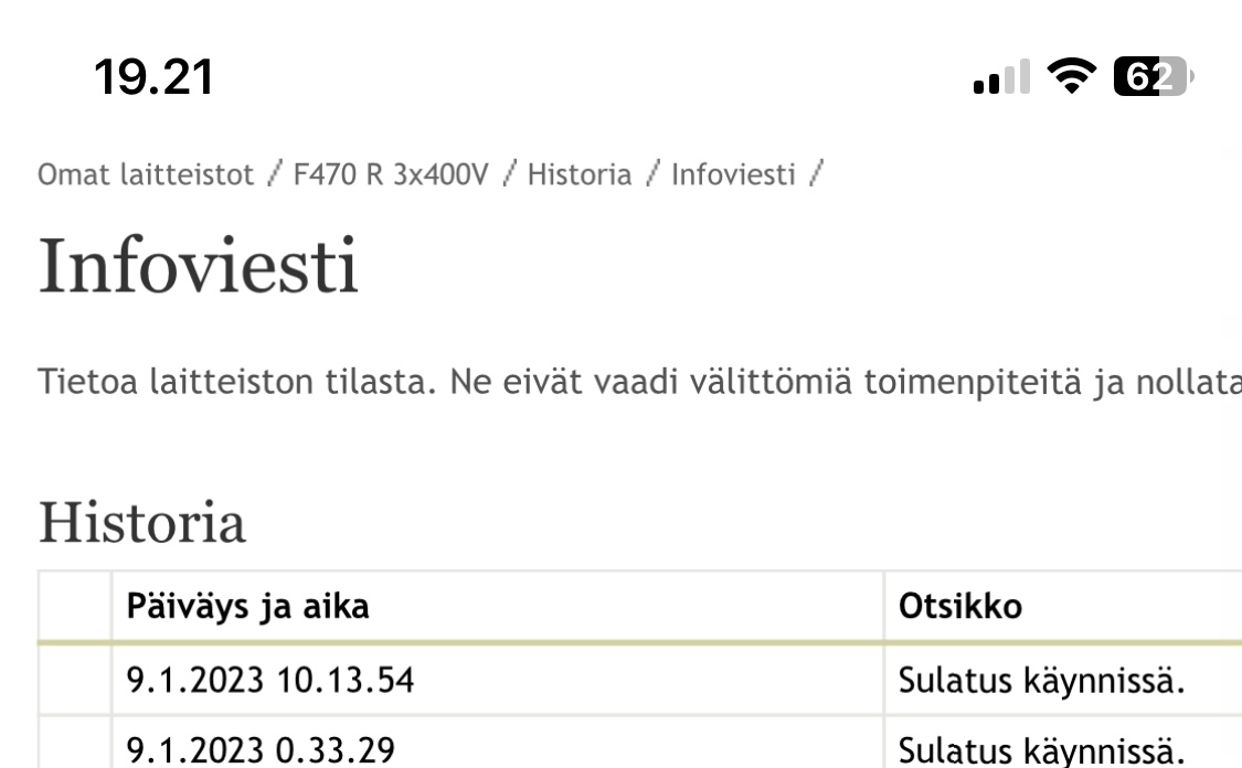 Eli kun meilläkin on sisälämpötilaa laskettu niin, että poistoilma tahtoo pyöriä nyt 20,2-20,6 välissä, niin sulatuksia tulee keskimäärin 3,0-3,5h välein näillä -5-10C pakkasilla. Ei ne nyt mitenkään dramaattisesti ole nostaneet sähkön kulutusta ainakaan meillä. Esim. -9C keskiulkolämpötilassa päiväkulutus (kaikki sähkö) pyörii 55-65kwh välissä (sisältää myös plugarin latauksen).