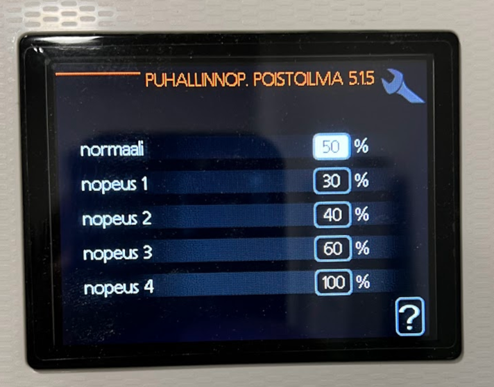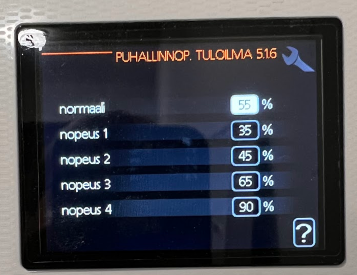 Poisto-/tuloilma nostettu normaalista ja mitatuista säädöistä 53/53% ->57/57%.