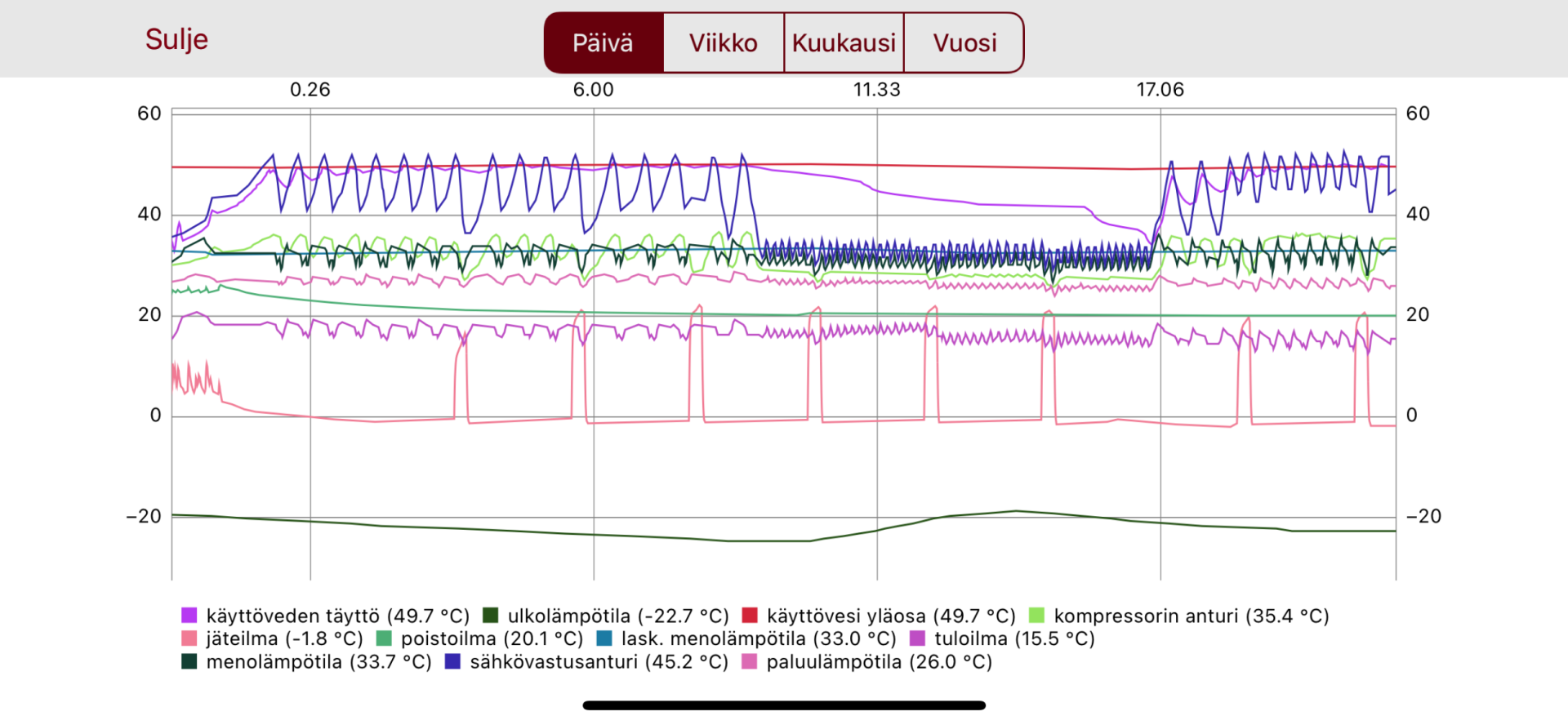 - Yksi asia mikä hieman mietityttää, että onko normaalia että tuo käyttöveden lämpötila laskee noin nopeasti kun vastukset menevät pois päältä (tarkempi kuva alla tältä aamupäivältä):