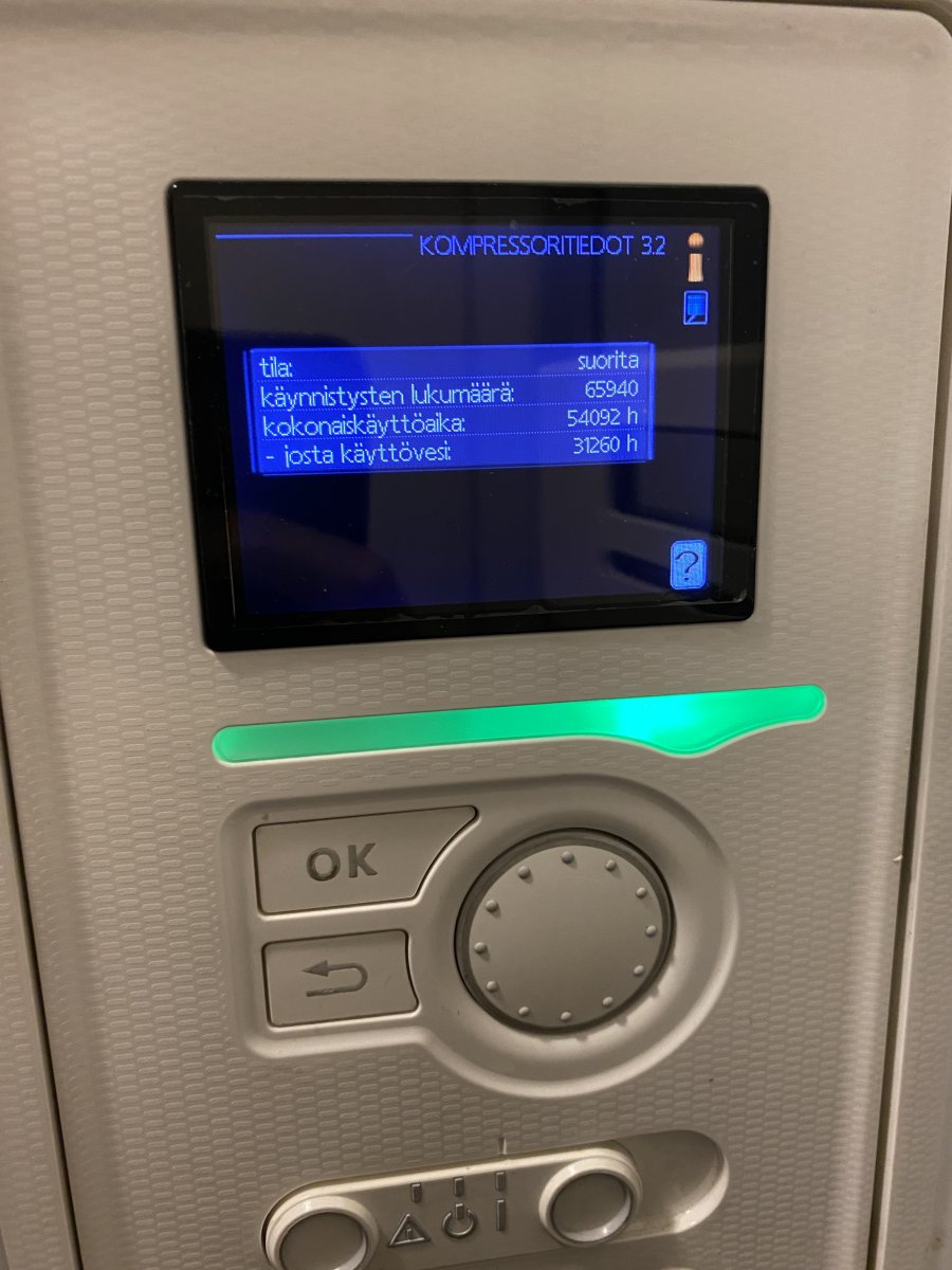 - Pe 06 alkaen estot päällä, säädin aamulla lämpökäyrän 0-käyrälle jossa menovesi pyyntö 20C. Noh sehän sitten sammutti samantein kompuran ja alkoi puhaltamaan lämmintä jäteilmaa ulos (facepalm) joten säädin sitten pyynnön käyrän mukaan takaisin 40C jotta tämä värkki tajuaisi ylläpitää lämpöjä kompuralla eikä väkisin ajaa niitä alas sinne 20C:een. Kokeilin säätää myös ilmanvaihtoa 5%:iin mutta se veti höyrystimen rajusti pakkaselle ja tuli painehälytys joten laitoin samantein takaisin normaaliksi (65%) ja kuittasin hälyn pois.